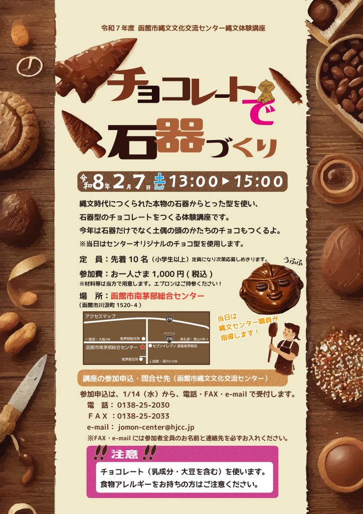 函館市縄文文化交流センターでは、令和8年2月7日(土)に縄文体験講座「チョコレートで石器づくり」を開催いたします。講座では、縄文時代につくられた本物の石器からとった型を使って、石器型のチョコレートをつくります。今回は、国宝「土偶」発見50年を記念して、土偶の頭のかたちのチョコもつくります。